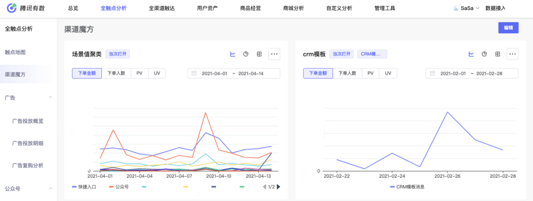 通过应用腾讯有数的“商城分析”功能,莎莎可以在腾讯有数“经营大盘”页面,直观看到小程序商城每天的用户浏览、加购、成交等数据情况。通过“页面分析”“坑位分析”等细化功能,莎莎得以更深入地了解消费者在小程序内的消费行为,比如在哪些页面停留时间较长、哪些商城坑位的转化率较好等等。