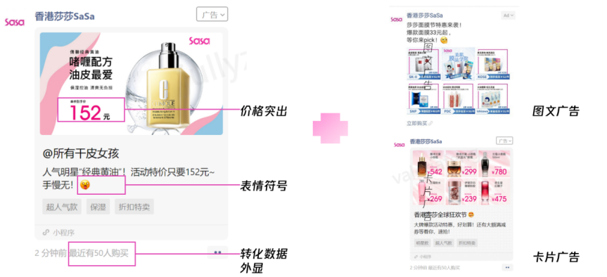 与此同时,在广告创意上,莎莎借助腾讯广告的运营策略指导,叠加了多种创意广告的形式,通过增加转化数据外显、标签ICON、表情符号、价格突出等创意调整,为每个用户展示了最优选的创意内容,有效刺激用户点击。在卡片形式的组合上,莎莎也调动了图文广告+卡片广告等多创意联投,持续作用于投放效果的优化。