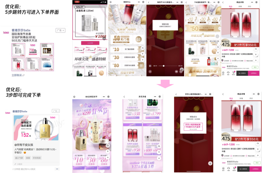 注意力碎片化时代下,冗长的转化链路,极为容易在转化跳转过程中,流失目标用户。为了让莎莎的目标用户实现更便捷、更快速的下单购买,腾讯帮助莎莎从技术层面进一步缩短转化链路,减少落地页数设置。优化前,用户从点击广告到进入下单界面需要经过5步跳转,优化后3步即可完成小程序直购下单,有效降低下单成本和新客成本。在这一链路中,莎莎着力于素材优化和爆品打造,不仅将爆款设置为中间页首屏顶图,更让消费者获得更流畅的优惠券领取体验,直接提升了小程序的核销转化。